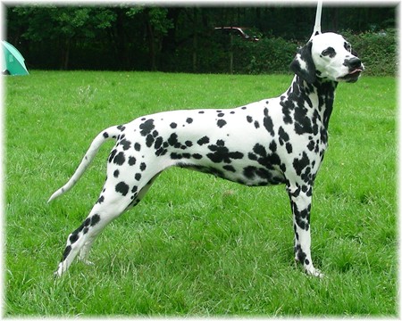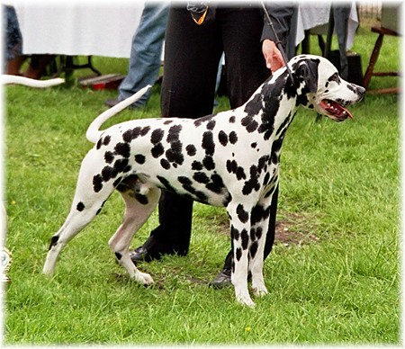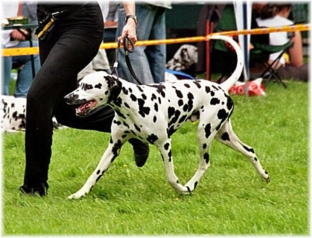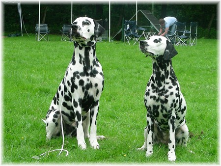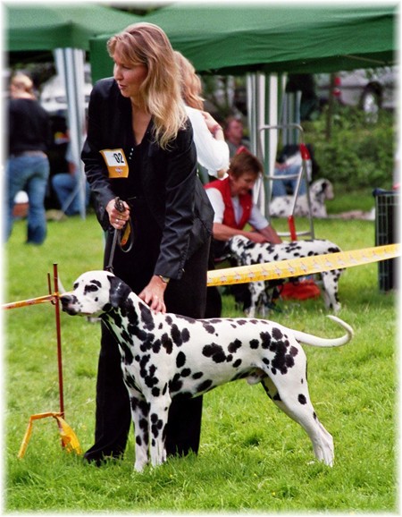sonniger Tag. Über 100 Dalmatiner waren angetreten, um sich einer norwegischen Richterin (Aase Jakobsen) zu präsentieren. Die Fahnen der Living Spots hielten (Handsome) Henry, Duke (Great Guy), Balou