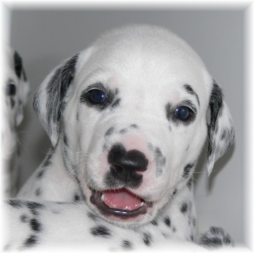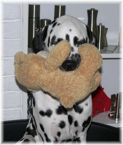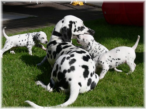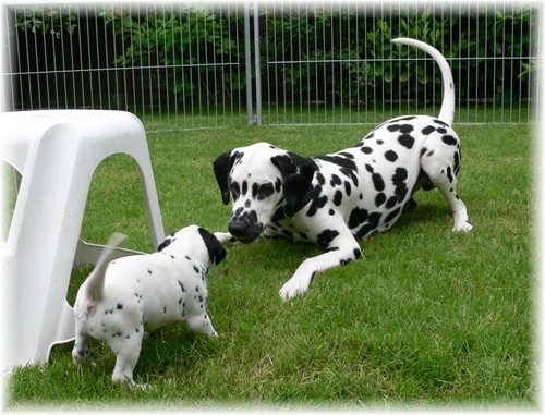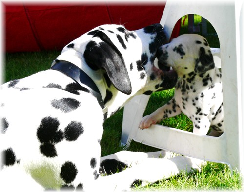Umzug ins Welpenhaus an. Hinzu kam, dass unsere H-chen über die Pfingstfeiertage Besuch von ihrem Neffen Duke (Great Guy of the Living Spots) bekamen. Duke erwies sich mit seinen gerade einmal sechseinhalb Monaten als ein überaus liebevoller “Kindergärtner”, der sich unermüdlich mit seinen Tanten und Onkel beschäftigte.