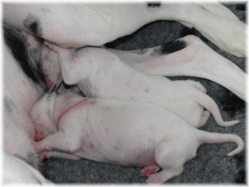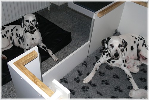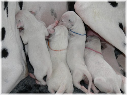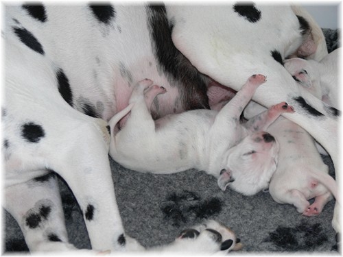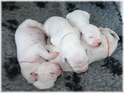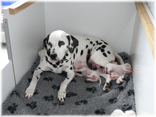 geht es prächtig - auch Mama Jamie hat sich gut erholt und kümmert sich treusorgend um ihren Nachwuchs. Frau Sommer hat sich als “feste Größe” vor der Wurfkiste entwickelt, was Jamie gelassen duldet. Unser “Sixpack”