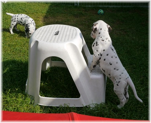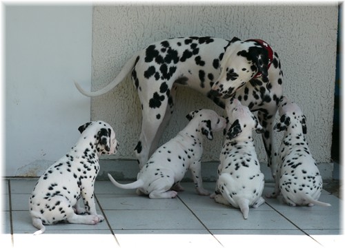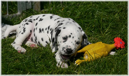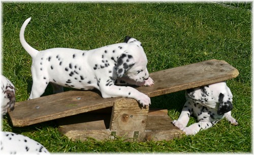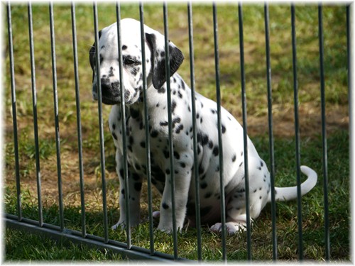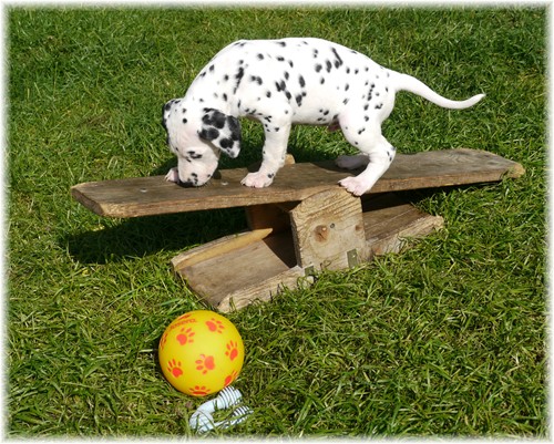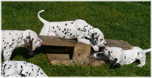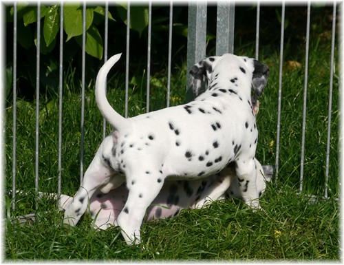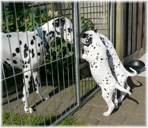 - sie genießen das wilde Leben im Welpenauslauf und natürlich auch den zahlreichen Besuch ...zweibeinig wie vierbeinig. So freuten wir uns über ein Wiedersehen mit unserem Piraten aus dem J-Wurf (Jack Sparrow), welcher aus der Schweiz angereist kam. Auch Frau Lila aus dem K-Wurf (Kooky Miss Violet) kam uns besuchen, um zu schauen, welcher smarte Junge in diesem Jahr ihr lilafarbenes Halsband trägt. Schließlich sah unsere Frau Sommer nach langer Pause auch ihre Mama Tammy, nebst Lebensgefährtin Sheila wieder. Wir und vor allem auch unsere Tupfentiere hatten viel Spaß miteinander.