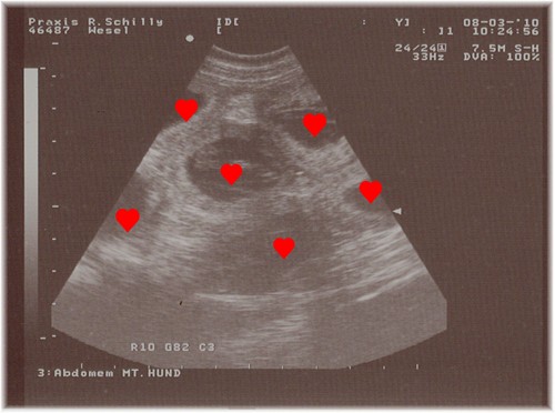 Wahrheit: Mo - immer noch mit straffer Bauchdecke und Idealfigur - wurde unserer Tierärztin vorgestellt, um sich einer Ultraschalluntersuchung zu unterziehen. Rein äußerlich war Mo so