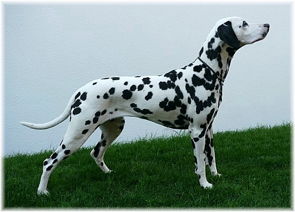 ausgesprochen elegante Hündin, natürlich vollzahnig, absolut korrekt in allen Proportionen, mit gesundem, reinweißem Fell und lackschwarzen, schön verteilten Flecken. Darüber hinaus hat Lilli tadellose HD-Werte,