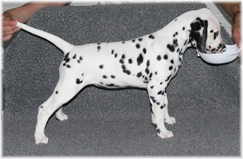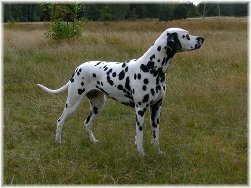 elegante Hündin, natürlich vollzahnig, absolut korrekt in allen Proportionen, mit gesundem, reinweißem Fell und lackschwarzen, schön verteilten Flecken. Sie ist ausgeglichen und unkompliziert, sehr freundlich im